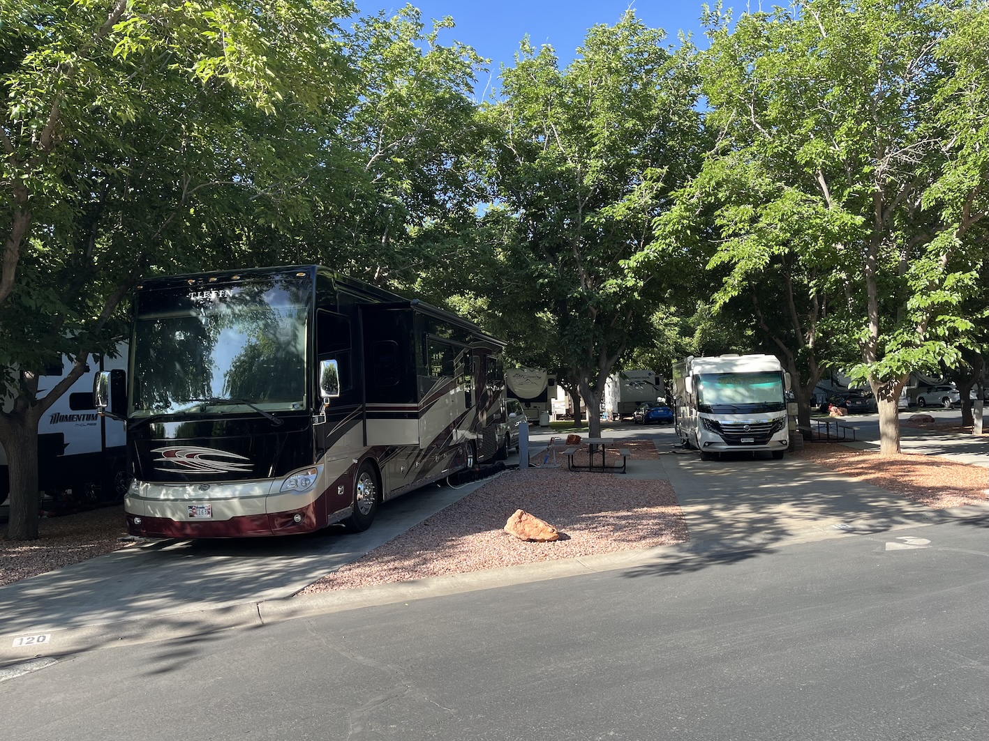 Hier zuerst noch ein Bild aus Hurricane und unserem dortigen Platz. Man beachte den Unterschied zu einem Amerikanischen Class A Wohnmobil! (komme mir vor wie ein Bulli neben dem Teil)