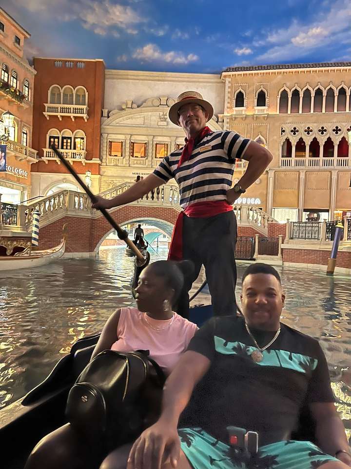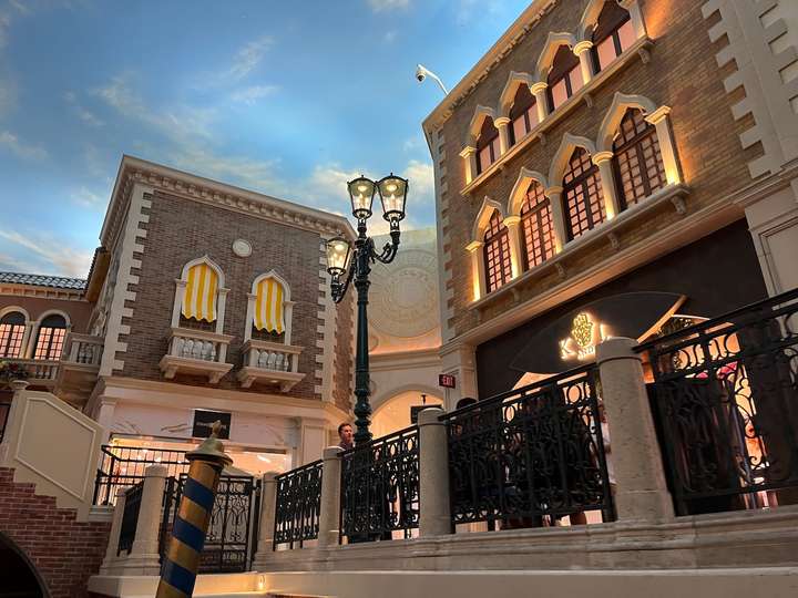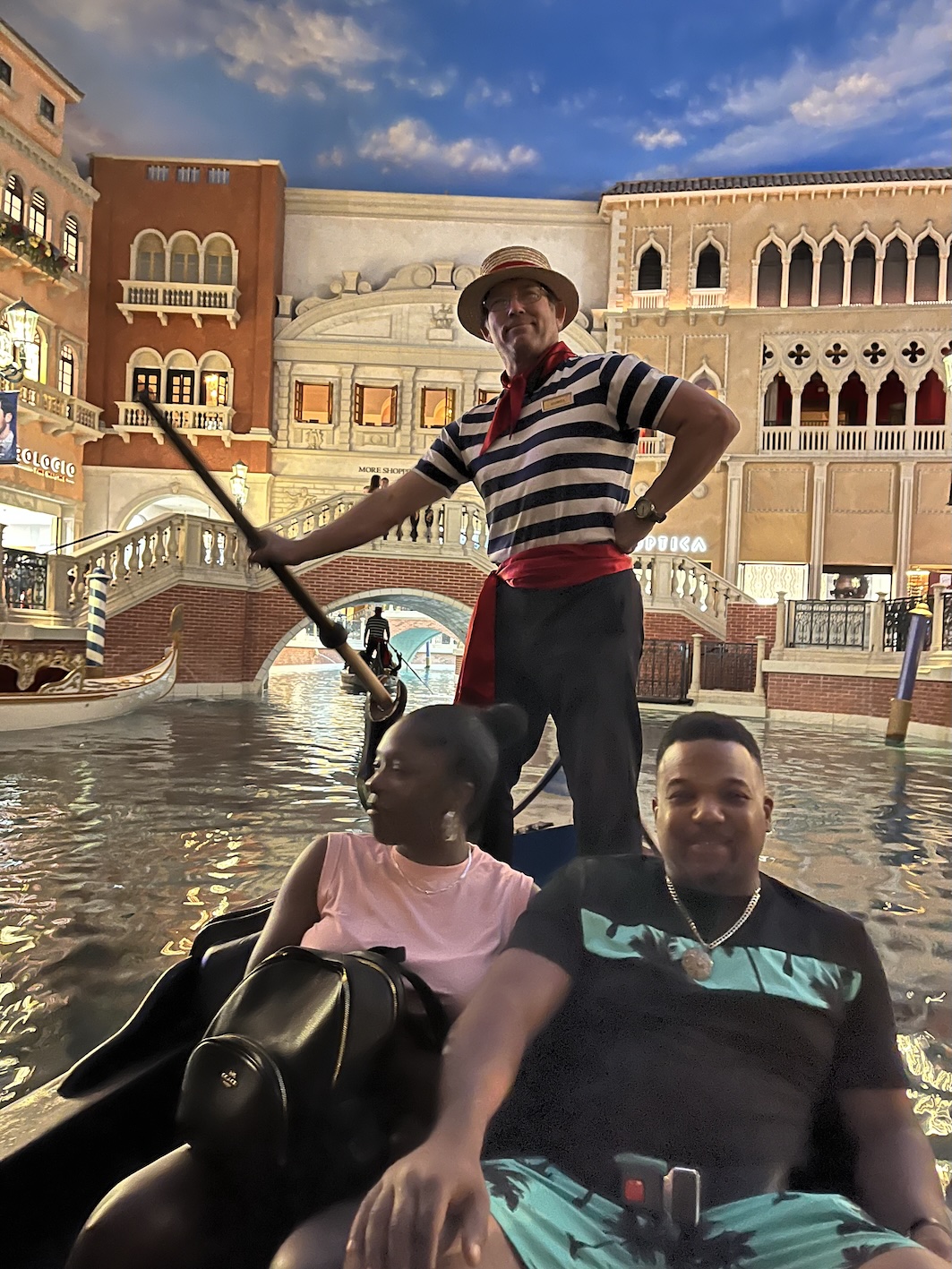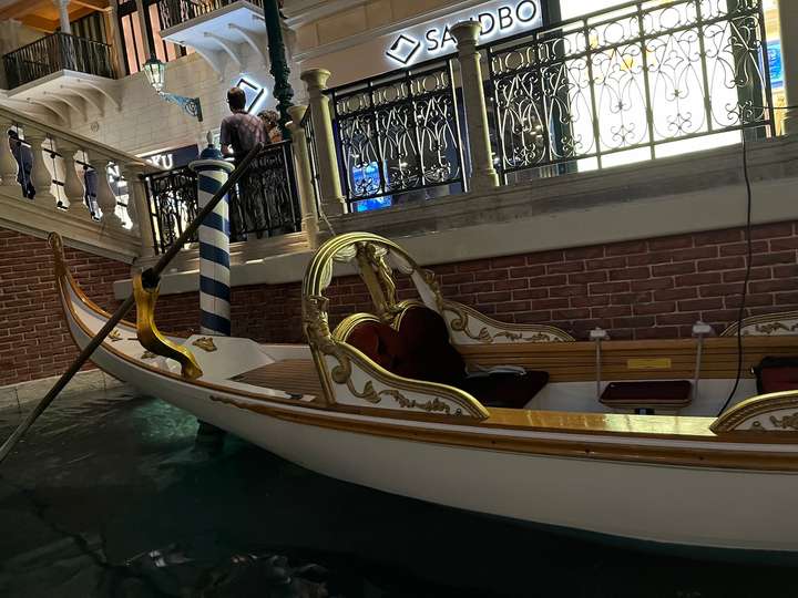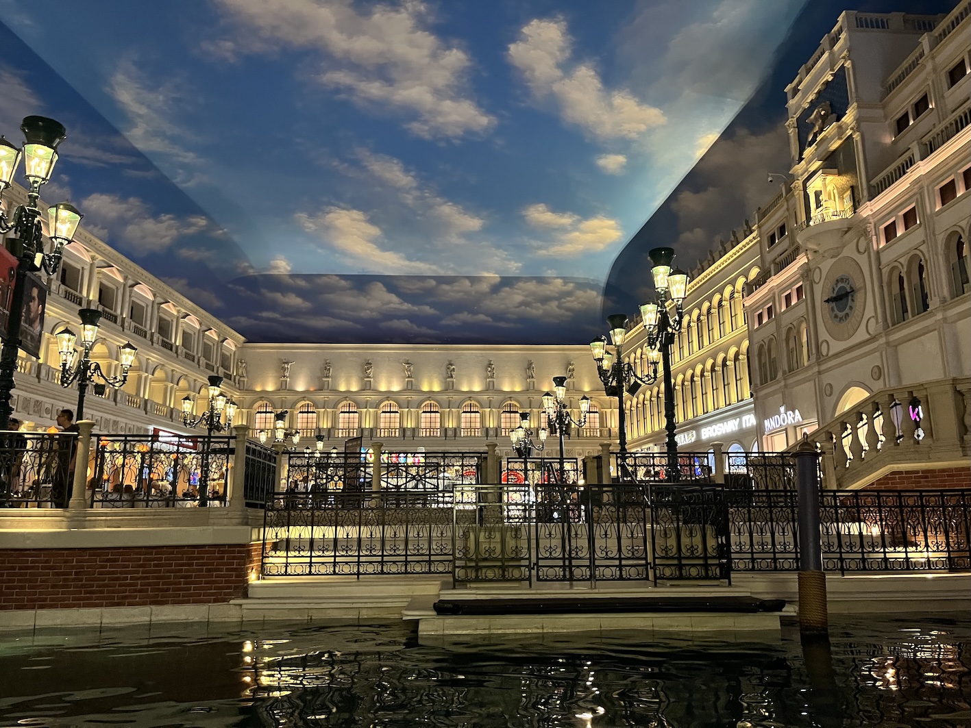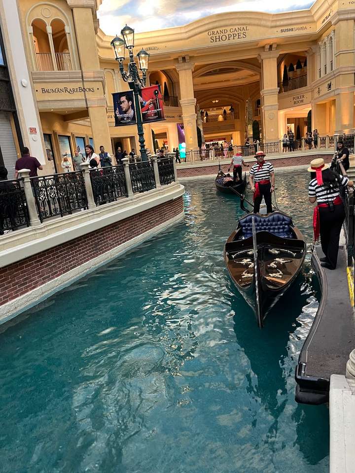 Ich habe Carina dazu überredet eine Fahrt mit einer Gondel innerhalb der Anlage zu machen. Die Fahrt durch den Kanal dauert etwa 15 Minuten, alles klimatisiert innerhalb des Gebäudes!😀 Der Zufall wollte es, dass wir den (einzigen!?) Gondoliere bekamen, der perfekte italienische Lieder zum besten geben konnte. Uns blieb vor Begeisterung echt die Spucke weg! Gesang kostet in Venedig meist extra, hier hatte er sich ein Trinkgeld verdient!