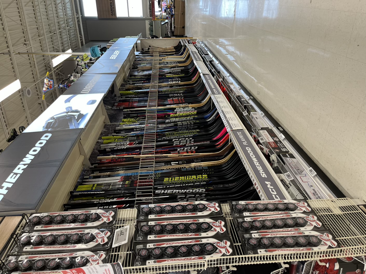 Der Regentag haben wir auch benutzt um in einen grossen Canadian Tire zu gehen. Die Kombination von Baumarkt, Sportgeschäft, Autozubehör und Freizeitartikel sucht seinesgleichen. Hier beispielhaft die Auswahl an Eishockey Schläger. (Sagt man dem so!?)