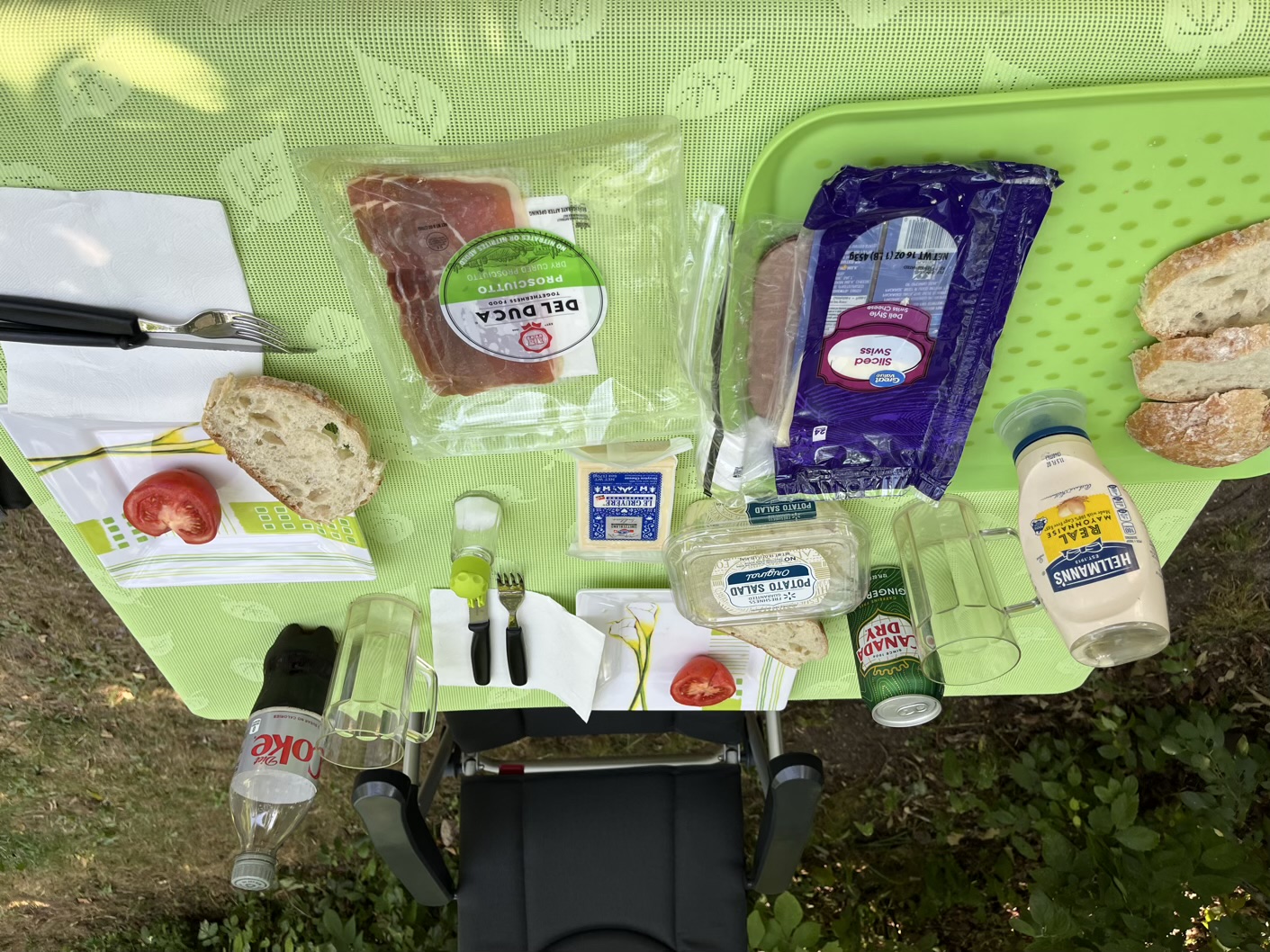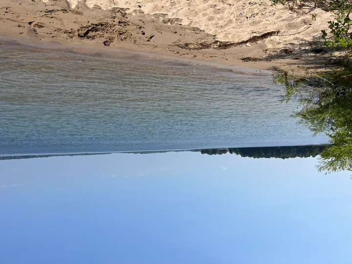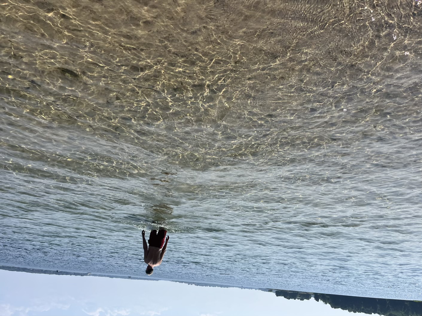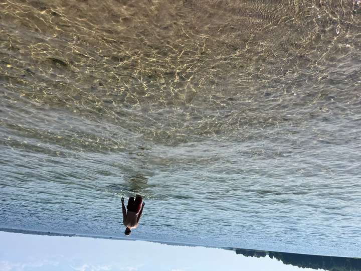 Unser Platz liegt direkt am Ufer des Stausees und wir haben einen kleinen aber feinen sandigen Privatstrand. So liegen wir in der Sonne und geniessen das erfrischende Bad im See. (geschätzt 24°)