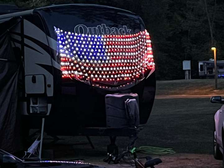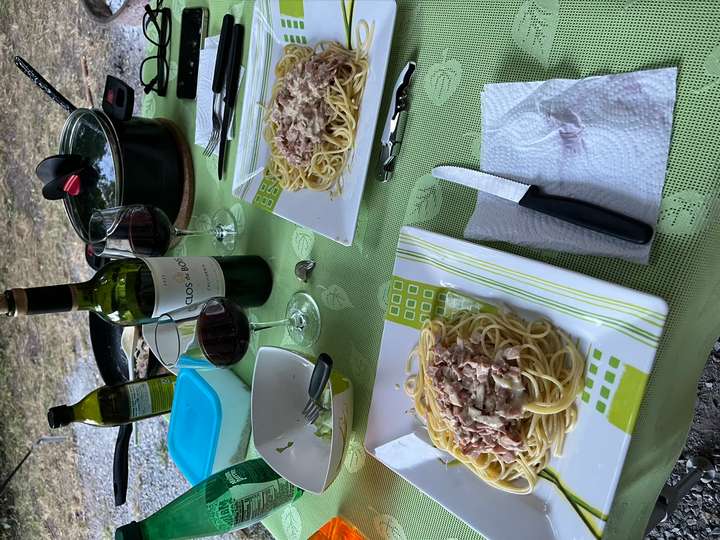 Spaghetti Carbonara und feiner Merlot zum zNacht, ist besser als jeder Burger! US Flagge, riesig aus Leuchtdioden - Patriotismus zum abwinken. (Natürlich Made in China)😎