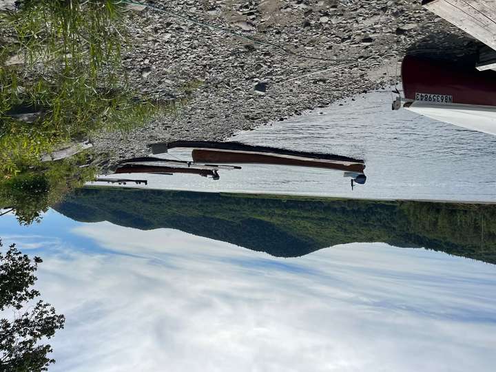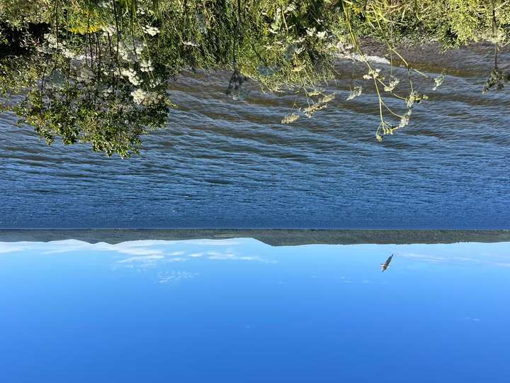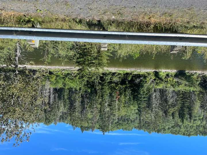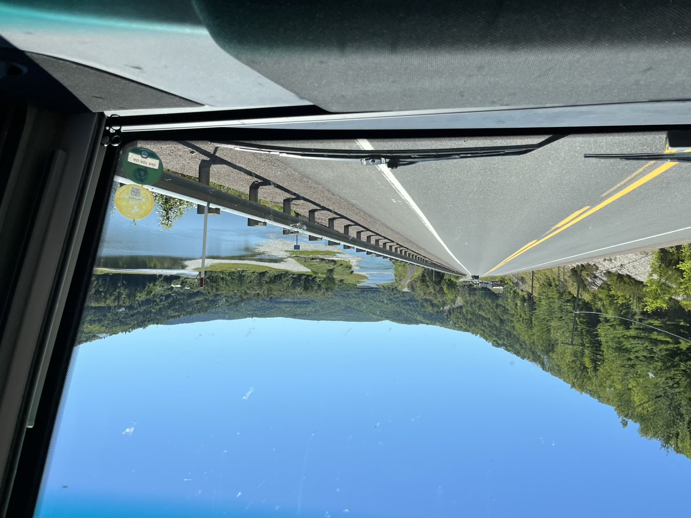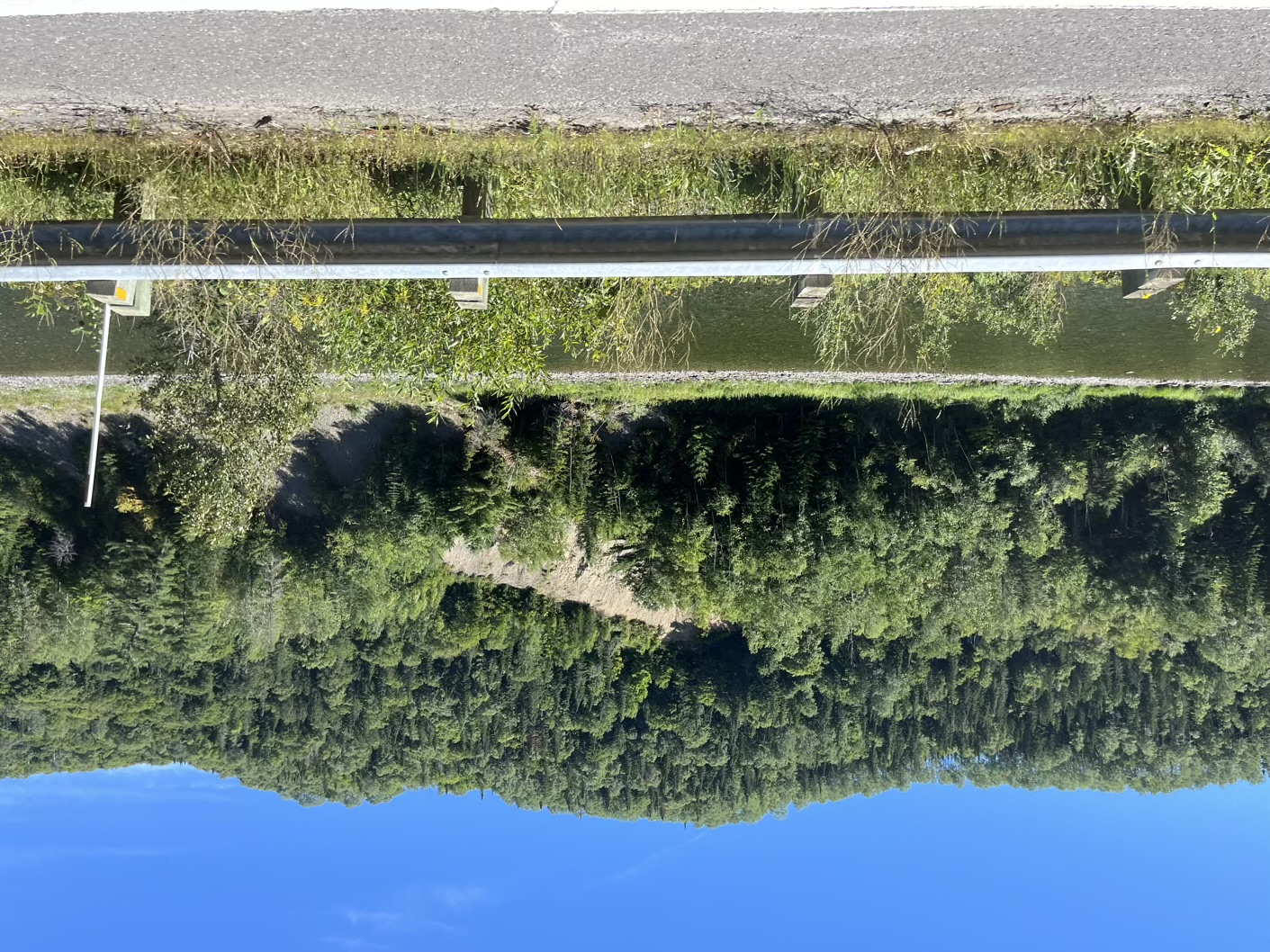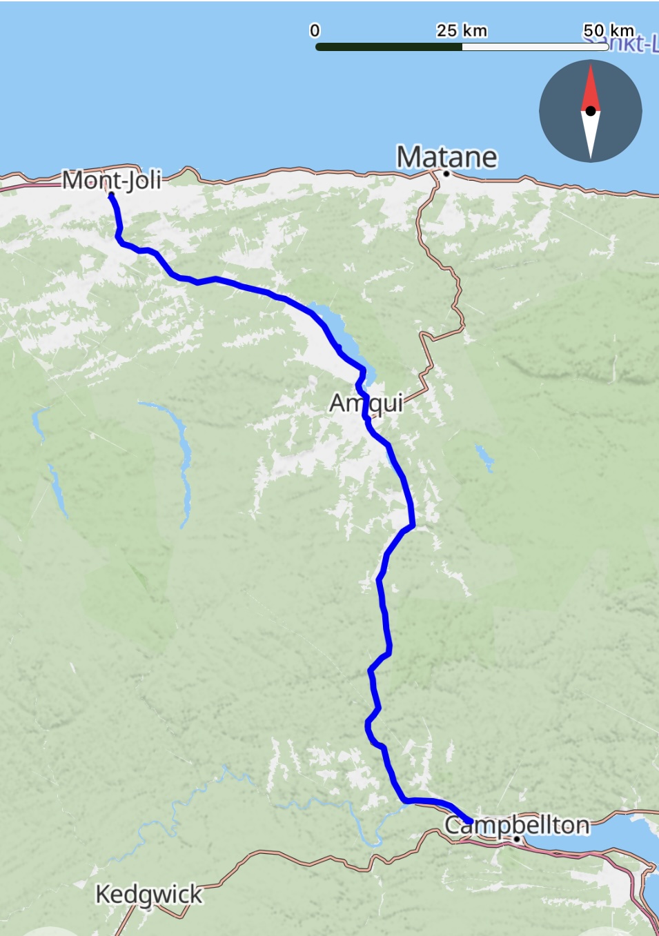 Übrigens sind wir hier am Fluss praktisch an der Grenze der Provinzen Quebec und New Brunswick. Das ist eben auch eine Zeitzonen-Grenze. Die Handys zeigen eine Stunde später wie das Navi an. Navi = Zeit via GPS = Quebec Zeit, während die Handyzeit vom Standort der Sende-Antennen abhängt, offensichtlich steht diese in der Provinz New Brunswick.