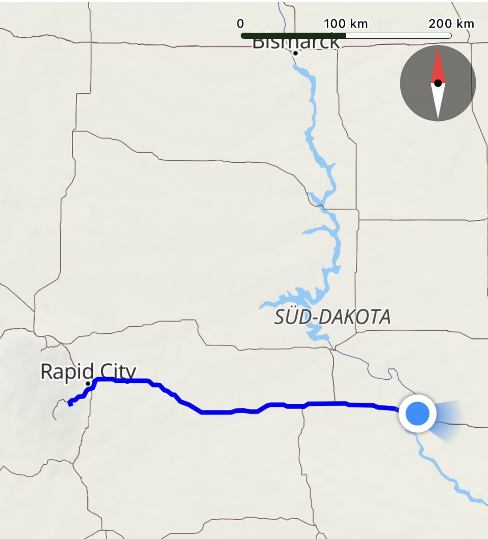 In Chamberlain haben wir nach 366km einen Stellplatz am Missouri gefunden, aber es ist wieder abartig heiss - 34.7° um 17:30 und heisser Wind mit 45km/h. Draussen sitzen ist selbst in im Schatten unangenehm. Baden könnte man höchstens im Indoor Pool, was definitiv nicht unserer Vorstellung entspricht. Wir werden nun täglich die Wetterprognosen und die Grosswetterlage anschauen und unsere weitere Routenplanung entsprechend anpassen.👎