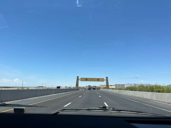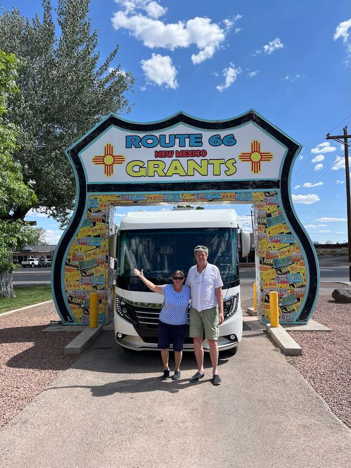 In New Mexico ist es bergiger und entlang dem Rio Grande ist es Grün, man sieht Pistazien Bäume und Grasland. Allmählich sind wir nun in Grants auf knapp 2000müM angekommen. Von der historischen Route 66 ist nicht mehr viel übrig geblieben. Immerhin ist in Grants ein ein Durchfahrts-Bogen wo ein Foto mit Fahrzeug gemacht werden kann.