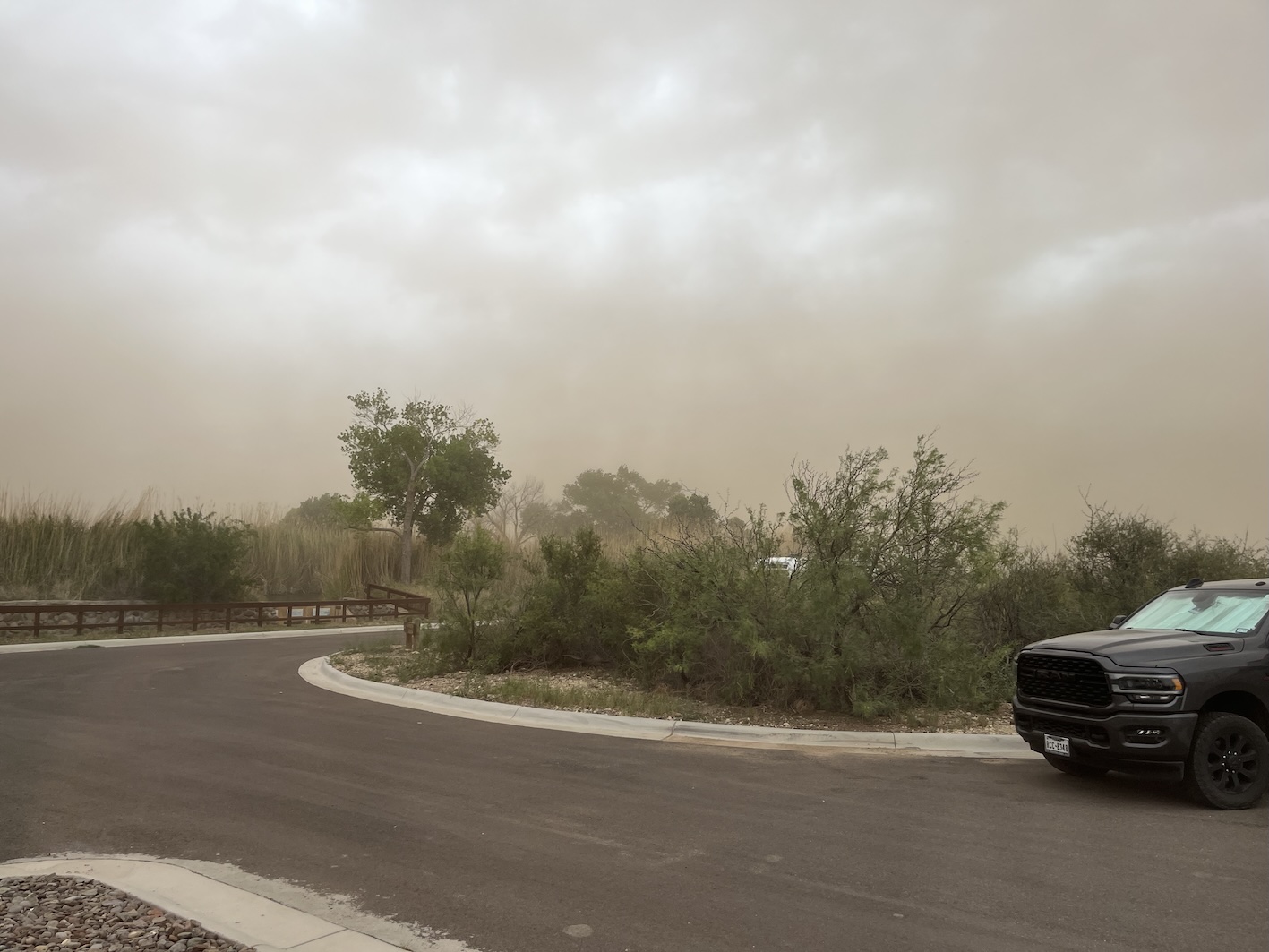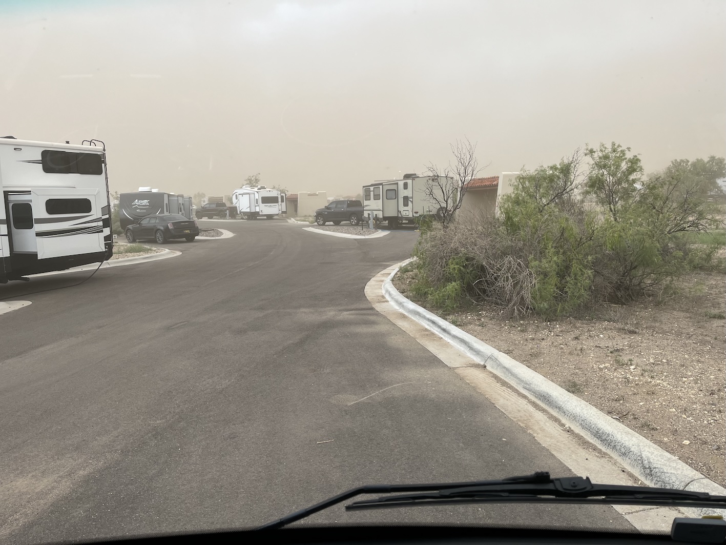 Im letzten State Park in Texas haben wir am Abend noch einen veritablen Sandsturm erleben dürfen. Das Womo wurde durchgeschüttelt und mit Sandstaub eingedeckt.