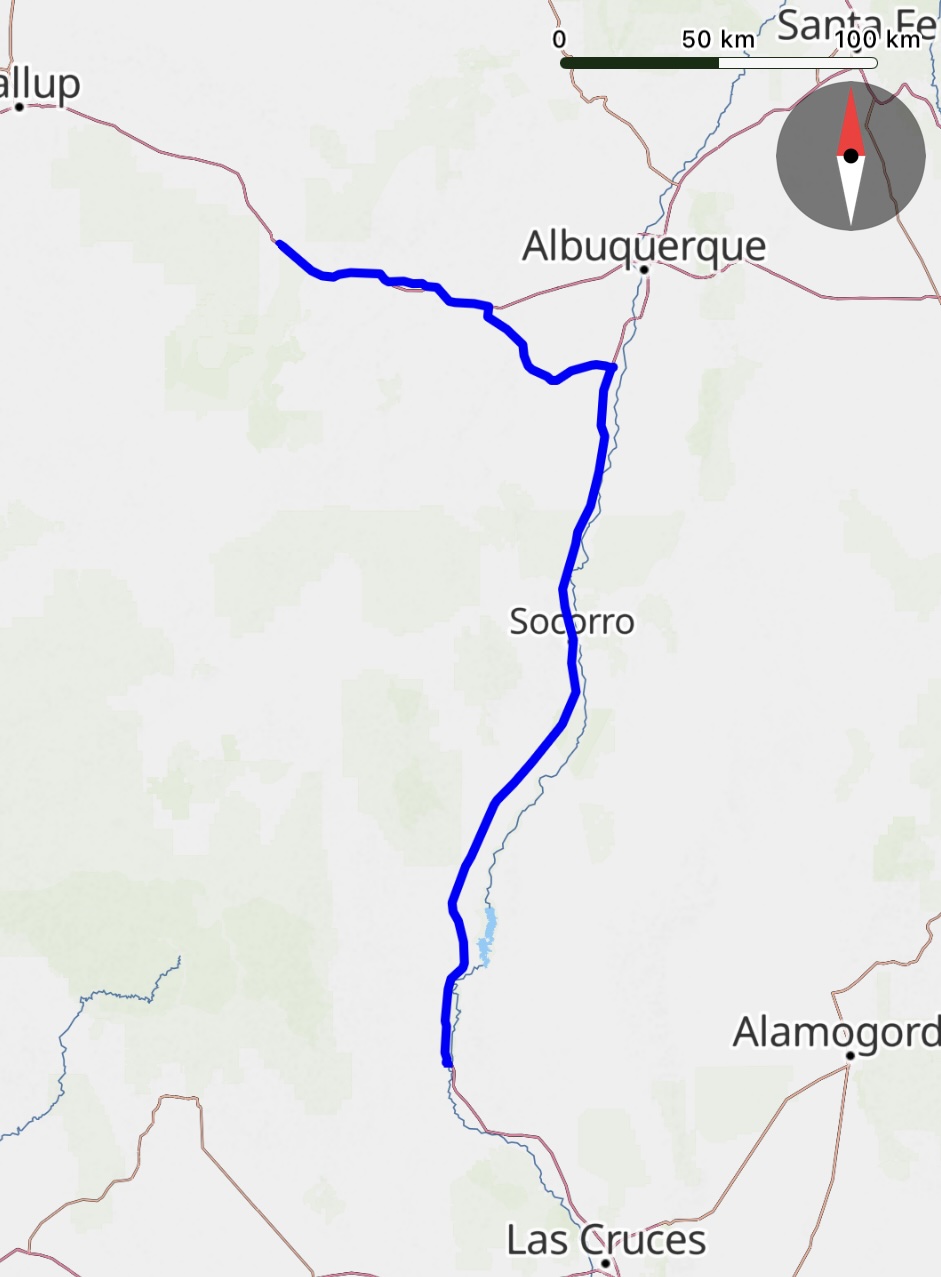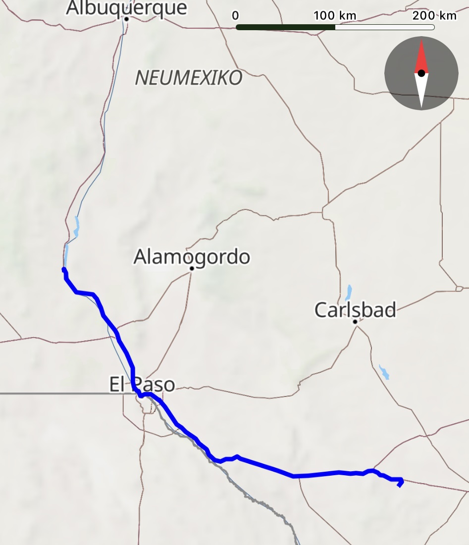 Nun sind wir zwei lange Tages Etappen mit 474km und 359km gefahren. Die Erste Fahrt ging über El Paso, Texas nach New Mexico, nämlich dem Cabello Perca Dam State Parc auch in New Mexico am Rio Grande gelegen.