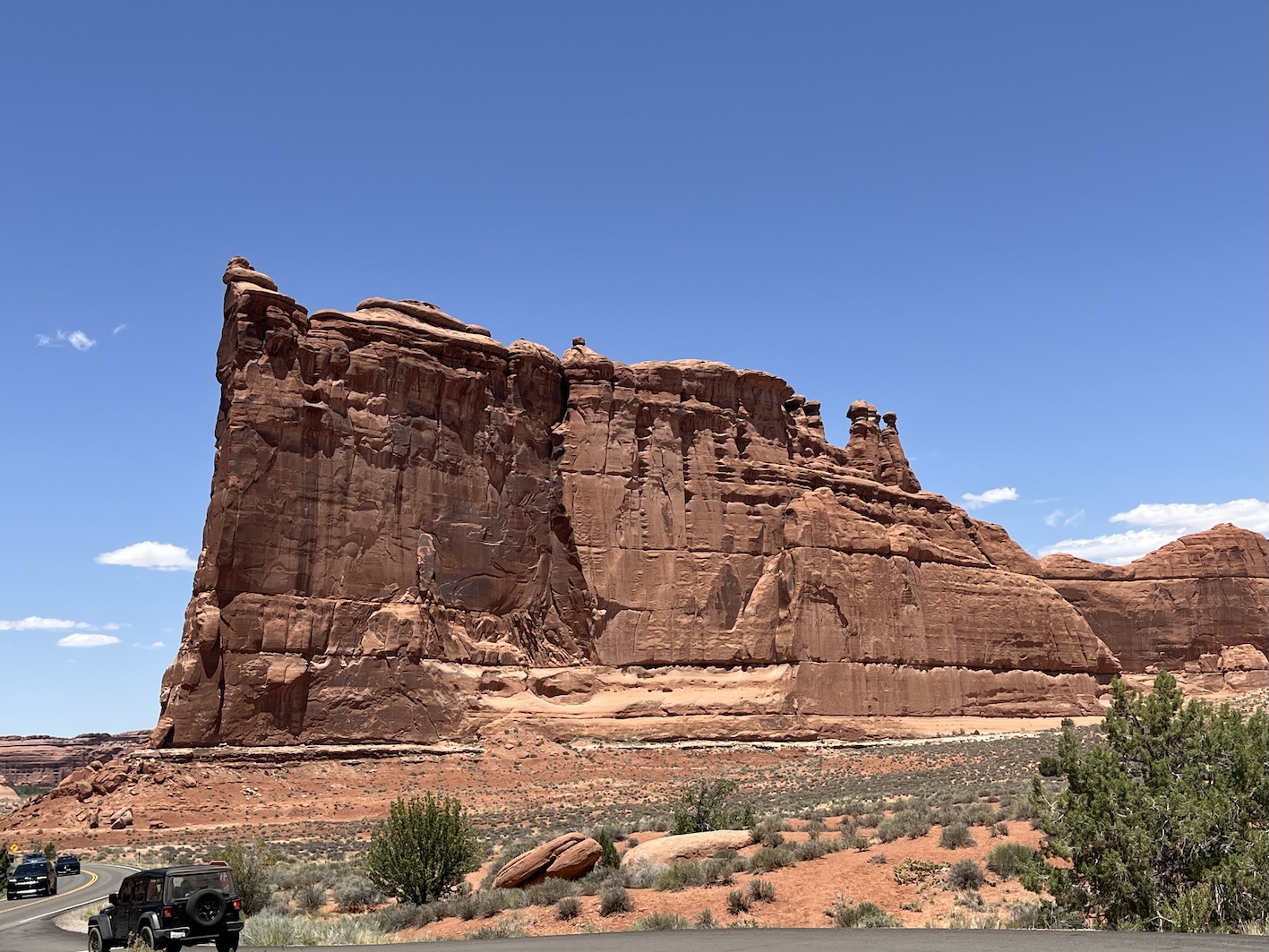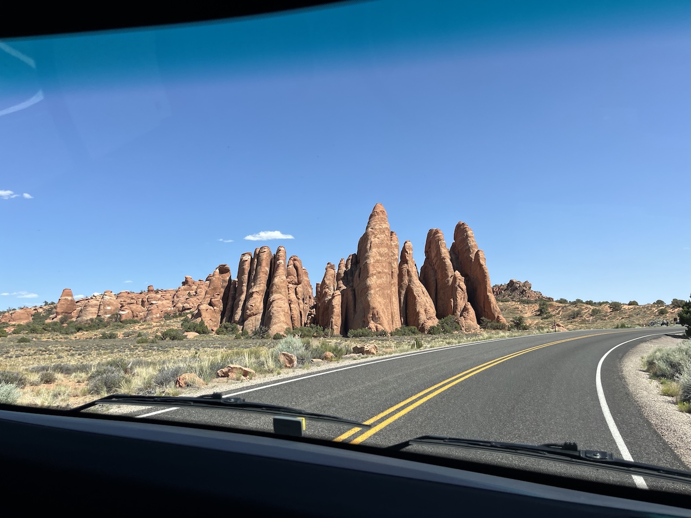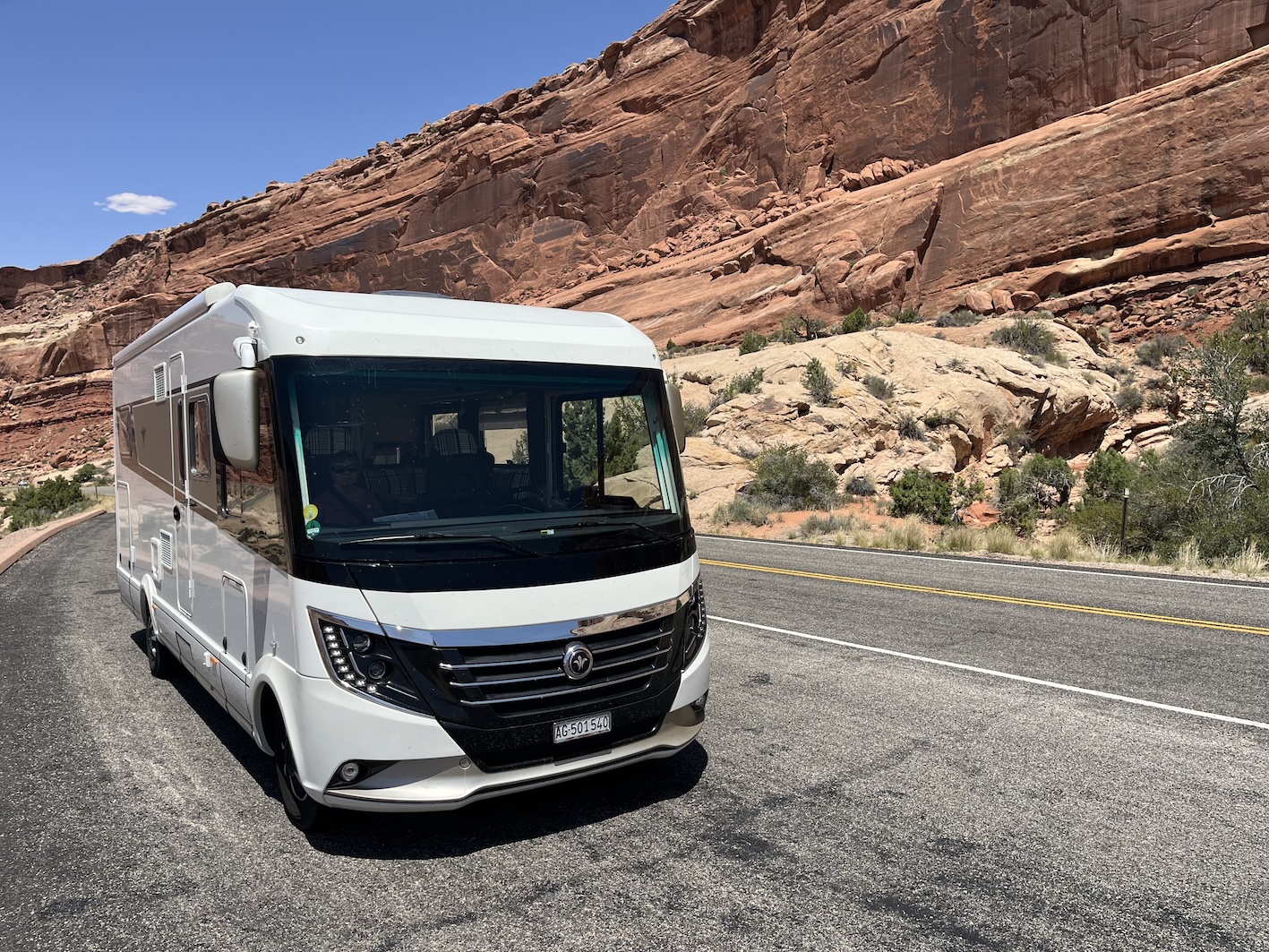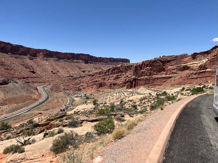 Dazu hatten wir die Dimension des Parks massiv unterschätzt, die Strasse hat enorm viele Kurven und es geht andauernd steil rauf und runter. Nach zwei Drittel der Strecke hatten wir plötzlich Panik, dass uns der Sprit ausgehen könnte und wir liegenbleiben. So haben wir uns entschlossen umzukehren, um in Moab zu tanken. Nach erneutem problemlosen Eintritt konnten wir auch den oberen Drittel des Parks bewundern. (wir haben die Lektion gelernt)😎